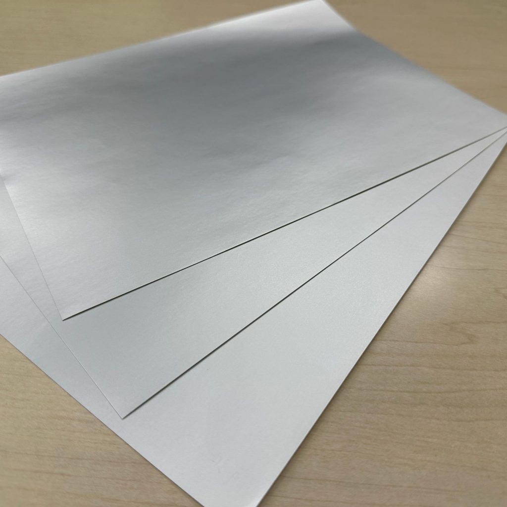 「ホイルタック 銀(消)」は、銀の輝きを持ちながらも、艶を抑えた落ち着いたメタリック感が魅力のタック紙です。