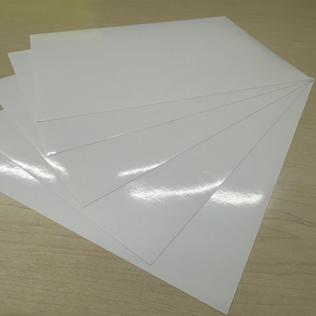 写真・細かなロゴ・グラデーションなどを極めて美しく再現できるため、化粧品や食品、雑貨ラベルなど“高級感を演出したい”デザインに広く使われています。アートタックよりも光沢が強く、ワンランク上の質感を持つタック紙として人気の素材です。
