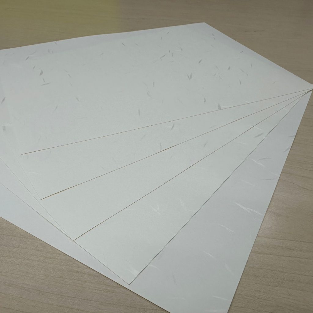和紙の繊維に大きめの雲母片を漉き込むことで 華やかさ・縁起の良さ を表現した素材です。