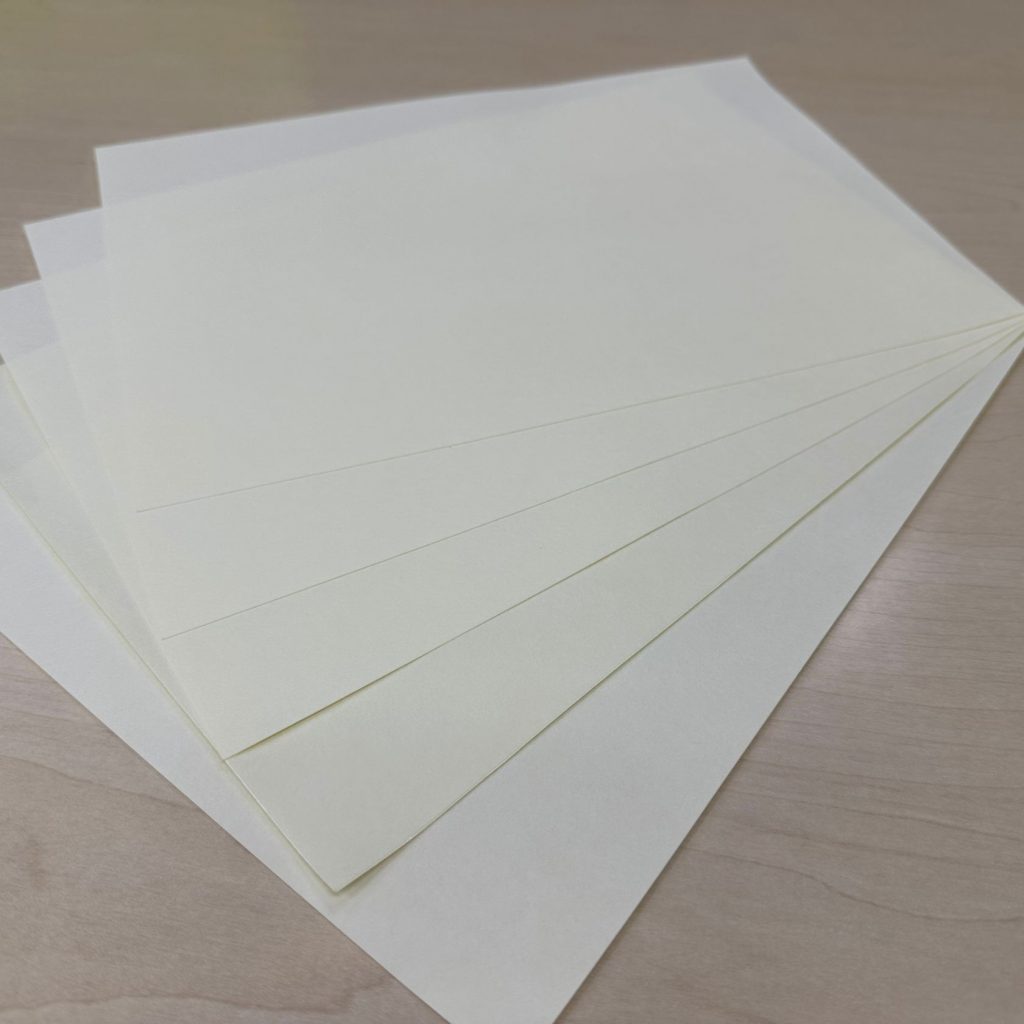 商品紹介(どんな商品?) レーヨン和紙光沢和紙和紙タックレーヨン和紙ラベル工芸品日本酒ラベル 強さと上品さを兼ね備えた和紙ラベル『和紙タック レーヨン』 商品紹介(どんな商品?) 2025.12.12 上品な光沢と強度を兼ね備えた「和紙タック レーヨン」 「和紙タック レーヨン」は、レーヨン繊維を漉き込んだ和紙を使用し、通常の和紙タックに比べて 強度が高く、光沢があり、上品な質感 が特徴のタック紙です。日本酒ラベルやギフト、工芸品など、ワンランク上の高級感を演出したい場面でよく選ばれています。和紙の柔らかさに、レーヨンの艶のある繊維が加わることで特別感のある仕上がりになります。 目次 和紙タック レーヨンとは?特徴・質感構成・用途まとめ:こんな方におすすめ 和紙タック レーヨンとは? 和紙タック レーヨンは、和紙の原料にレーヨン繊維を混ぜ合わせることで、光沢のある繊維表情・高い強度・上品さ を持たせたタック紙です。レーヨン特有のつややかな繊維が散る耐久性が高く、破れにくい和紙の柔らかさと高級感を両立高見えするラベル表現ができる一般的な和紙タックと比べ、より“華やかで高級感のある印象”に仕上がります。 特徴・質感 レーヨン繊維の自然な光沢が美しい 光に当たると細かな繊維が輝き、上品な表情を見せる。強度が高く、破れにくい 瓶・箱・曲面への貼付にも安心。高級感のある和の質感 日本酒・工芸品・ギフト商品にぴったり。印刷適性も良好 黒・金・赤などの濃色との相性が特に良い。加工にも適応 箔押し・型抜き・エンボスでさらに表情を引き立てる。 構成・用途 【構成】基材:レーヨン繊維入り和紙表面:繊維が見える自然な光沢粘着剤:水溶強粘着タイプセパレーター:黄色のセパレーター【主な用途】・日本酒・焼酎ラベル(高級ライン)・ギフト用ラベル・工芸品・雑貨ブランドのラベル・贈答品パッケージ・和風の高級食品ラベル・お祝い・縁起物向けパッケージ まとめ:こんな方におすすめ 【デザイン面で相性が良いポイント】・金・黒・赤など濃色が美しく映える・レーヨン繊維の光沢が自然な高級感を演出・シンプルなロゴでも上質な印象になる・和の世界観を上品に表現できる【こんな方におすすめ】・高級感ある和紙ラベル素材を探している方・日本酒・工芸品・ギフト商品のラベルを制作する方・上質で耐久性のあるタック紙を使いたいブランド・紙そのものの“美しさ”で魅せたいデザイナー 和紙タック レーヨン を注文する 紙の専門のECサイト『紙もっと!』はこちらから 株式会社立川紙業五十嵐 広治(いがらし こうじ)日本洋紙板紙卸商業組合 認定「紙営業士」株式会社立川紙業/ECサイト「紙もっと!」管理人紙とともに育ち、紙を愛し、紙の魅力を伝えることを仕事にしています。現在は、株式会社立川紙業にて以下を中心に活動中・ECサイト「紙もっと!」の企画・運営・コーポレートサイト/ブログの制作・更新・InstagramやyoutubeなどSNS運用による情報発信全国の印刷会社・デザイナー・個人ユーザーに向けて紙の楽しさ・奥深さを日々発信しています。