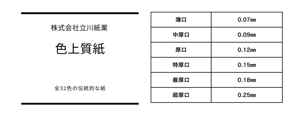 商品紹介(どんな商品?) カラー用紙冊子表紙台紙名刺多用途紙学校用紙封筒紀州色上質紙もっと色上質紙 選べる色と厚みがうれしい。定番カラー用紙『紀州色上質』とは? 商品紹介(どんな商品?) 2024.10.172025.11.27 1954年発売の定番カラー『紀州色上質』とは? 目次 紀州色上質とは?オンデマンド印刷適性とおすすめ活用法厚さ・連量と用途紙の風合いと色展開まとめ:こんな方におすすめやってみた! 紀州色上質とは? 『紀州色上質』は、豊富な色と厚さのバリエーションをそなえた定番の色紙シリーズ。その扱いやすさとラインナップの広さから、学校や官公庁、企業などでも長年親しまれてきた実績あるカラー用紙です。シンプルな見た目ながら、色の印象や厚みの違いで表現に幅をもたせることができます。 オンデマンド印刷適性とおすすめ活用法 オフセット印刷だけでなく、オンデマンド印刷やレーザープリンタにも対応。比較的インクの乗りも良く、文字主体の資料からカラー表紙まで幅広く使用できます。おすすめ用途例:学校や公共機関の案内状・配布資料商品台紙や書類仕分け用のカラー表紙封筒、名刺、チケット、冊子カバーなどの事務系ツールオリジナルステーショナリーやイベントアイテム 厚さ・連量と用途 厚みのバリエーションが豊富なため、用途に応じた最適な選択が可能です。・薄口:案内状、伝票、書類の仕分けなどに・中厚口:リーフレット・チケット・厚口:リーフレット・ポスター・特厚口:表紙、フライヤー、ポスター・最厚口:名刺、表紙、タグ、チケット・超厚口:名刺・ポストカード紙もっと!では取り扱いはございませんがさらに薄い『特薄口』も存在します! 最近ではお問い合わせも減りましたので掲載は薄口〜超厚口までとなっております! 一応掲載はさせて頂きますが、アマリリスが現在庫限りで配色になりますのでご注意お願いします。33色から32色になる予定で、在庫も残りわずかです! 紙の風合いと色展開 色は全32色でさまざまな用途にてご利用いただけます表面は滑らかで筆記性も良好マットな質感で光沢を抑えた上品な仕上がり色ごとの印象の違いを生かして、用途やターゲットに合わせた使い分けが可能現行の色数は32色(アマリリスは除いてあります)『紙もっと!』では色上質の見本帳も販売をしております。 まとめ:こんな方におすすめ 色と厚みを選び分けて使いたい方コストを抑えつつ、見た目に個性を出したい制作担当者公共機関・学校・オフィスで使いやすい紙を探している方名刺やカード類に使える色紙を探している方 やってみた! 色上質の醍醐味はこれ!デザインを昭和レトロを表現したい場合に色上質の良さが引き立ちます! 通常のコピー用紙などの白い紙では表現できないところを醸し出すことができます! ぜひ皆さんもお試しください!! 色上質 を注文する 紙の専門のECサイト『紙もっと!』はこちらから 株式会社立川紙業五十嵐 広治(いがらし こうじ)日本洋紙板紙卸商業組合 認定「紙営業士」株式会社立川紙業/ECサイト「紙もっと!」管理人紙とともに育ち、紙を愛し、紙の魅力を伝えることを仕事にしています。現在は、株式会社立川紙業にて以下を中心に活動中・ECサイト「紙もっと!」の企画・運営・コーポレートサイト/ブログの制作・更新・InstagramやyoutubeなどSNS運用による情報発信全国の印刷会社・デザイナー・個人ユーザーに向けて紙の楽しさ・奥深さを日々発信しています。